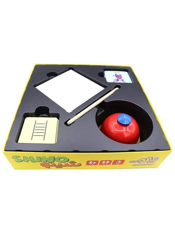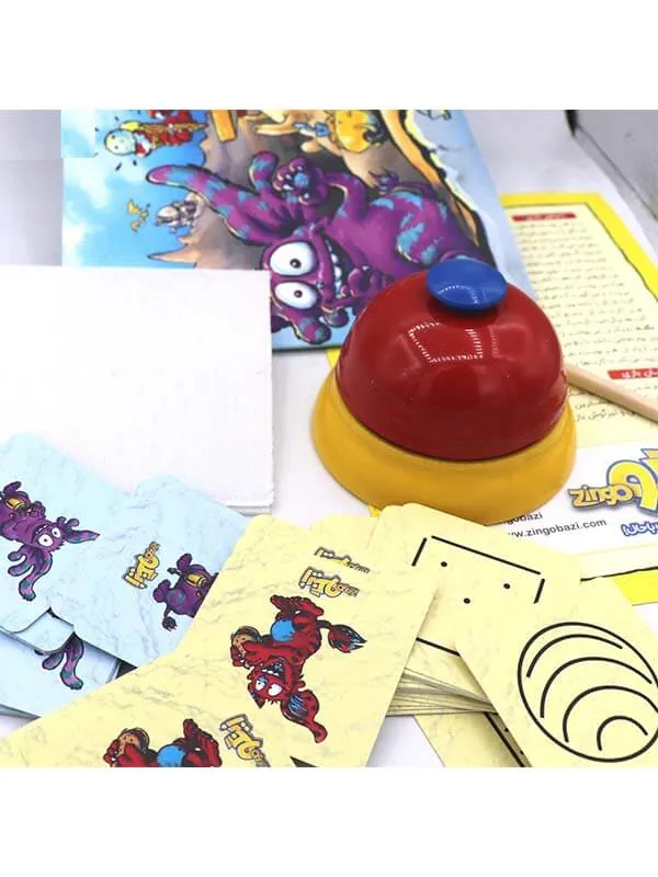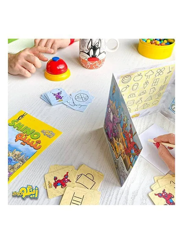 1) 50 کارت شکل (25 تا آبی یعنی سخت و 25 کارت زرد یعنی آسون 2) 1 بوم نقاشی 3) چوب نقاشی 4) صفحه محافظ 5)1 زنگ
